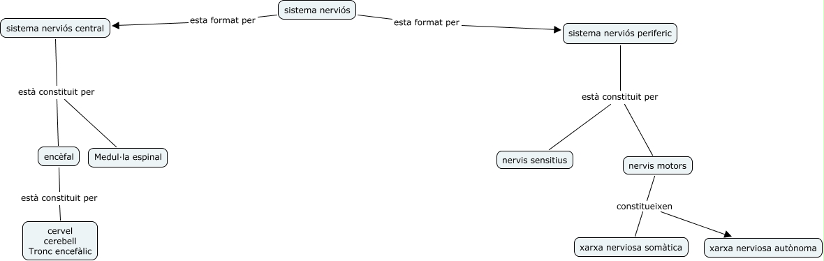 Este Cmap, tiene información relacionada con: sandra, sistema nerviós esta format per sistema nerviós periferic, nervis motors constitueixen xarxa nerviosa autònoma, nervis motors constitueixen xarxa nerviosa somàtica, sistema nerviós central està constituit per encèfal, sistema nerviós central està constituit per Medul·la espinal, encèfal està constituit per cervel cerebell Tronc encefàlic, sistema nerviós periferic està constituit per nervis motors, sistema nerviós periferic està constituit per nervis sensitius, sistema nerviós esta format per sistema nerviós central