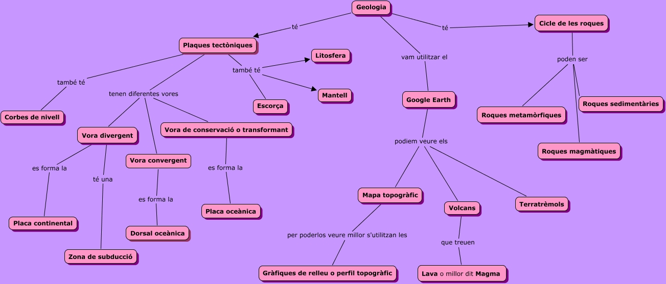 Este Cmap, tiene información relacionada con: Geologia, Plaques tectòniques també té Litosfera, Google Earth podiem veure els Mapa topogràfic, Plaques tectòniques tenen diferentes vores Vora de conservació o transformant, Plaques tectòniques també té Mantell, Vora de conservació o transformant es forma la Placa oceànica, Vora convergent es forma la Dorsal oceànica, Geologia té Plaques tectòniques, Plaques tectòniques també té Escorça, Google Earth podiem veure els Terratrèmols, Plaques tectòniques tenen diferentes vores Vora convergent, Cicle de les roques poden ser Roques magmàtiques, Mapa topogràfic per poderlos veure millor s'utilitzan les Gràfiques de relleu o perfil topogràfic, Plaques tectòniques també té Corbes de nivell, Cicle de les roques poden ser Roques sedimentàries, Plaques tectòniques tenen diferentes vores Vora divergent, Vora divergent es forma la Placa continental, Vora divergent té una Zona de subducció, Geologia vam utilitzar el Google Earth, Cicle de les roques poden ser Roques metamòrfiques, Volcans que treuen Lava o millor dit Magma