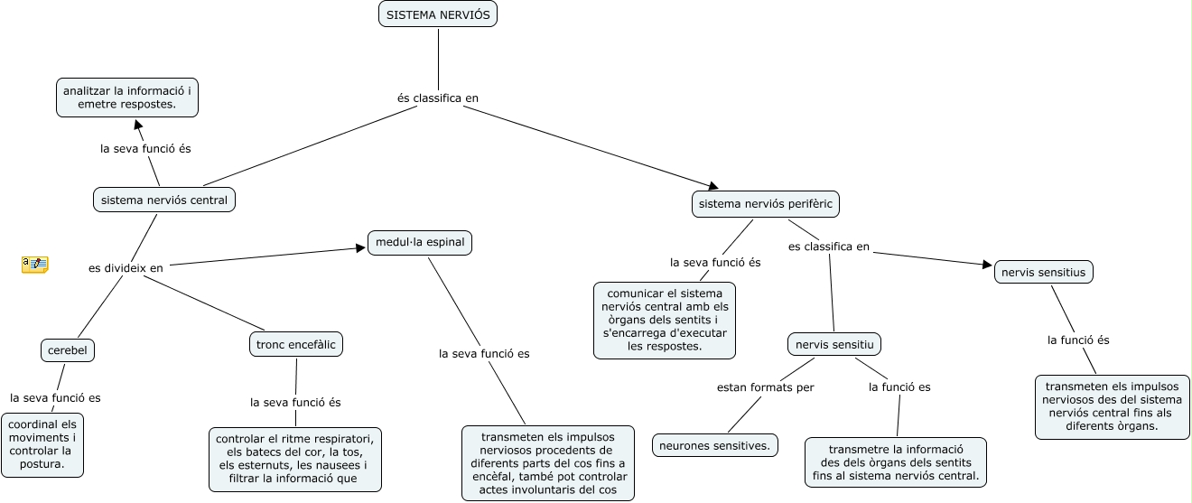 Este Cmap, tiene información relacionada con: sistema nervíos, cerebel la seva funció es coordinal els moviments i controlar la postura., tronc encefàlic la seva funció és controlar el ritme respiratori, els batecs del cor, la tos, els esternuts, les nausees i filtrar la informació que, SISTEMA NERVIÓS és classifica en sistema nerviós perifèric, sistema nerviós perifèric la seva funció és comunicar el sistema nerviós central amb els òrgans dels sentits i s'encarrega d'executar les respostes., nervis sensitiu la funció es transmetre la informació des dels òrgans dels sentits fins al sistema nerviós central., sistema nerviós perifèric es classifica en nervis sensitius, sistema nerviós central la seva funció és analitzar la informació i emetre respostes., medul·la espinal la seva funció es transmeten els impulsos nerviosos procedents de diferents parts del cos fins a encèfal, també pot controlar actes involuntaris del cos, SISTEMA NERVIÓS és classifica en sistema nerviós central, sistema nerviós perifèric es classifica en nervis sensitiu, nervis sensitius la funció és transmeten els impulsos nerviosos des del sistema nerviós central fins als diferents òrgans., nervis sensitiu estan formats per neurones sensitives., sistema nerviós central es divideix en tronc encefàlic, sistema nerviós central es divideix en cerebel, sistema nerviós central es divideix en medul·la espinal