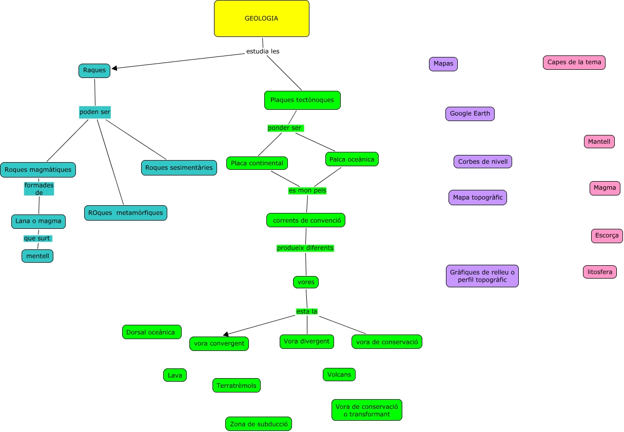 Este Cmap, tiene información relacionada con: geologia, Raques poden ser ROques metamòrfiques, Roques magmàtiques formades de Lana o magma, Palca oceànica es mon pels corrents de convenció, Raques poden ser Roques magmàtiques, Plaques tectònoques ponder ser Palca oceànica, corrents de convenció produeix diferents vores, GEOLOGIA estudia les Plaques tectònoques, vores esta la vora convergent, Lana o magma que surt mentell, Raques poden ser Roques sesimentàries, Plaques tectònoques ponder ser Placa continental, GEOLOGIA estudia les Raques, Placa continental es mon pels corrents de convenció, vores esta la vora de conservació, vores esta la Vora divergent
