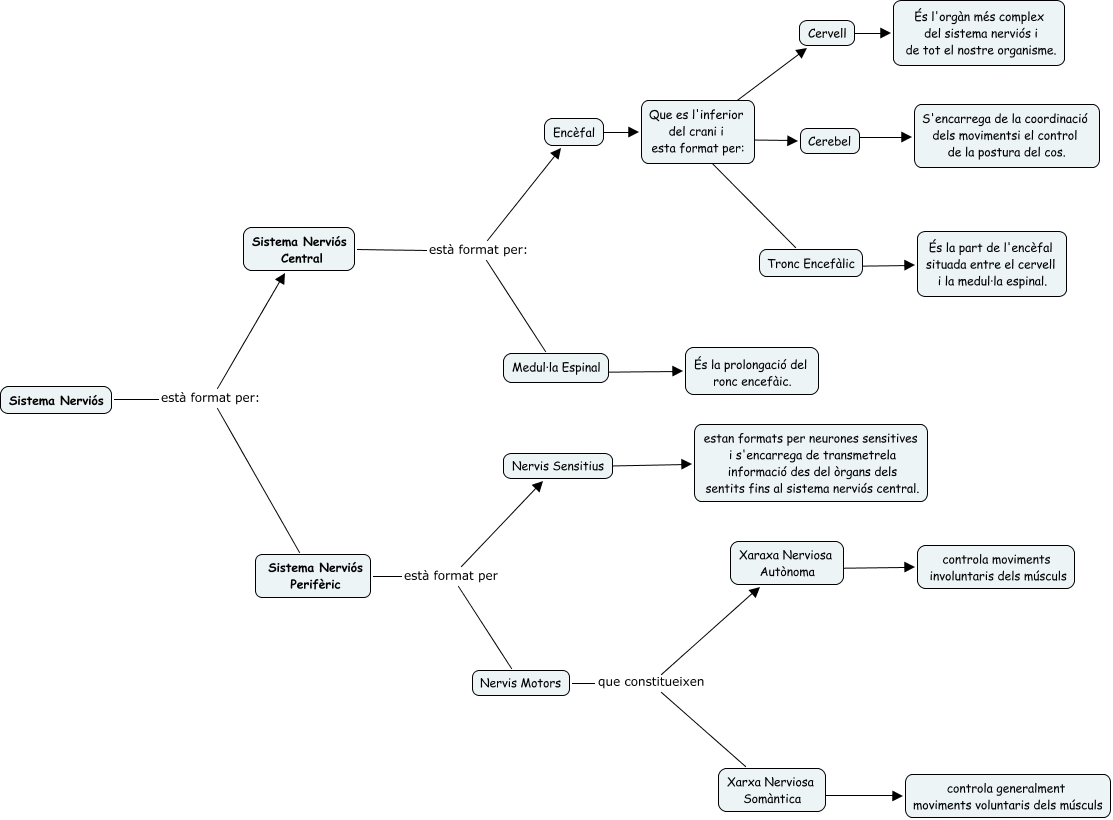 Este Cmap, tiene información relacionada con: sistema nervios Cristian Urbano Jurado, Nervis Motors que constitueixen Xarxa Nerviosa Somàntica, Que es l'inferior del crani i esta format per: ???? Cerebel, Tronc Encefàlic ???? És la part de l'encèfal situada entre el cervell i la medul·la espinal., Nervis Sensitius ???? estan formats per neurones sensitives i s'encarrega de transmetrela informació des del òrgans dels sentits fins al sistema nerviós central., Que es l'inferior del crani i esta format per: ???? Tronc Encefàlic, Sistema Nerviós Perifèric està format per Nervis Sensitius, Sistema Nerviós Central està format per: Encèfal, Medul·la Espinal ???? És la prolongació del ronc encefàic., Que es l'inferior del crani i esta format per: ???? Cervell, Sistema Nerviós Perifèric està format per Nervis Motors, Cervell ???? És l'orgàn més complex del sistema nerviós i de tot el nostre organisme., Sistema Nerviós Central està format per: Medul·la Espinal, Xarxa Nerviosa Somàntica ???? controla generalment moviments voluntaris dels músculs, Sistema Nerviós està format per: Sistema Nerviós Central, Cerebel ???? S'encarrega de la coordinació dels movimentsi el control de la postura del cos., Xaraxa Nerviosa Autònoma ???? controla moviments involuntaris dels músculs, Sistema Nerviós està format per: Sistema Nerviós Perifèric, Nervis Motors que constitueixen Xaraxa Nerviosa Autònoma, Encèfal ???? Que es l'inferior del crani i esta format per:
