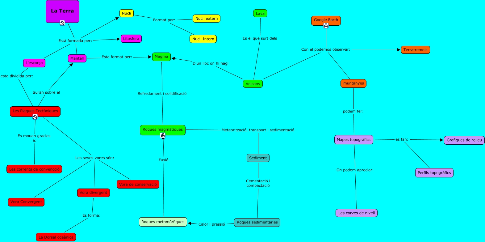 Este Cmap, tiene información relacionada con: Geologia2, Lava Es el que surt dels Volcans, Les Plaques Tectòniques Es mouen gracies a: Les corrents de convencció, Roques magmàtiques Meteorització, transport i sedimentació Sediment, Les Plaques Tectòniques Les seves vores són: Vora de conservació, Mapes topogràfics es fan: Grafiques de relleu, Nucli Format per: Nucli Intern, L'escorça esta dividida per: Les Plaques Tectòniques, muntanyes podem fer: Mapes topogràfics, La Terra Està formada per: Nucli, Roques metamòrfiques Fusió Roques magmàtiques, Google Earth Con el podemos observar: muntanyes, Vora divergent Es forma: La Dorsal oceànica, Les Plaques Tectòniques Suran sobre el Mantell, Magma Refredament i solidificació Roques magmàtiques, Sediment Cementació i compactació Roques sedimentaries, Roques sedimentaries Calor i pressió Roques metamòrfiques, Les Plaques Tectòniques Les seves vores són: Vora Convergent, Mantell Esta format per: Magma, La Terra Està formada per: Mantell, La Terra Està formada per: Litosfera