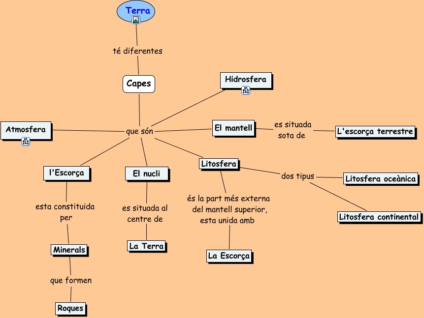Este mapa conceptual tiene información relacionada a: capes de la terra, l'Escorça esta constituida per Minerals, Litosfera dos tipus Litosfera continental, Minerals que formen Roques, Terra té diferentes Capes, Litosfera dos tipus Litosfera oceànica, Capes que són l'Escorça, Capes que són El mantell, Capes que són Litosfera, Capes que són Atmosfera, El mantell es situada sota de L'escorça terrestre, Capes que són Hidrosfera, Capes que són El nucli, Litosfera és la part més externa del mantell superior, esta unida amb La Escorça, El nucli es situada al centre de La Terra