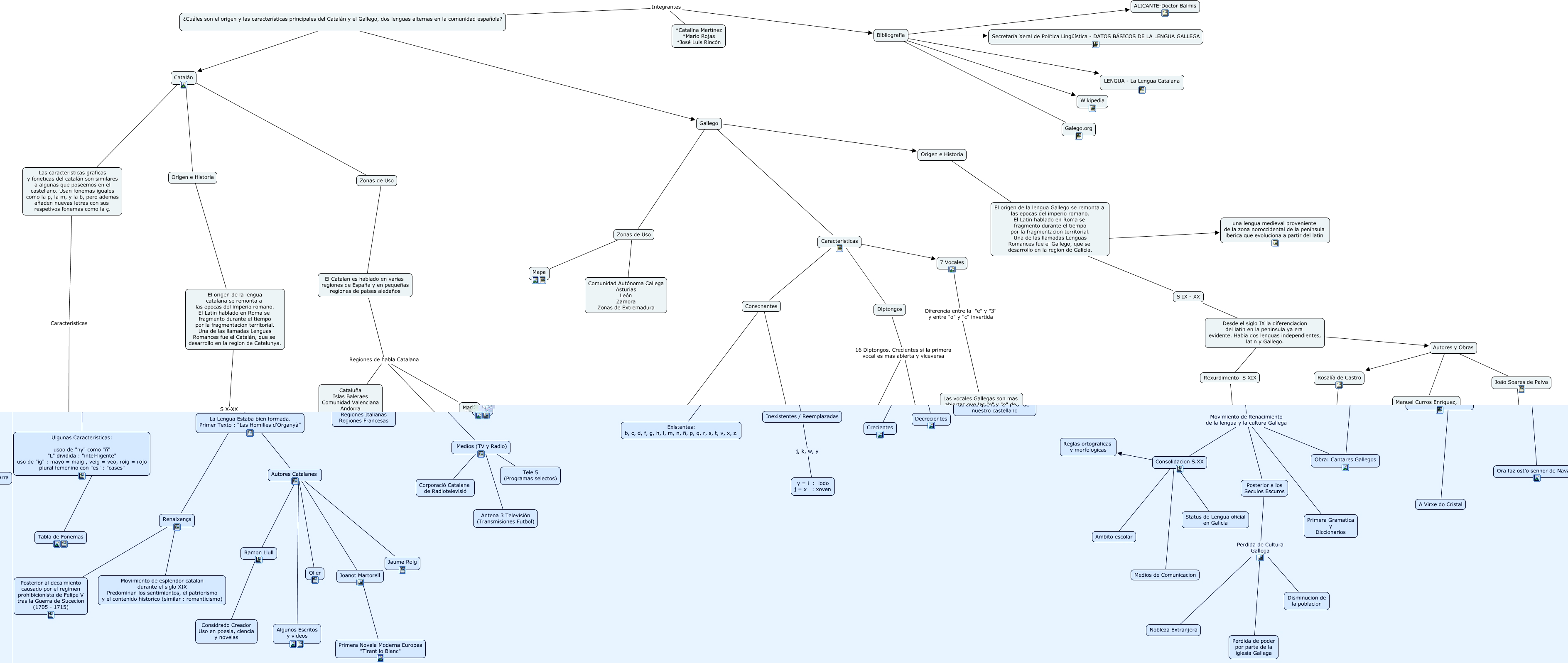 Este Cmap, tiene información relacionada con: Origen de Letras y Números, Medios (TV y Radio) ???? Corporació Catalana de Radiotelevisió, Consonantes ???? Existentes: b, c, d, f, g, h, l, m, n, ñ, p, q, r, s, t, v, x, z., S IX - XX ???? Desde el siglo IX la diferenciacion del latin en la peninsula ya era evidente. Habia dos lenguas independientes, latin y Gallego., Ulgunas Caracteristicas: usoo de "ny" como "ñ" "L" dividida : "intel-ligente" uso de "ig" : mayo = maig , veig = veo, roig = rojo plural femenino con "es" : "cases" ???? Tabla de Fonemas, ¿Cuáles son el origen y las características principales del Catalán y el Gallego, dos lenguas alternas en la comunidad española? ???? Gallego, Autores Catalanes ???? Joanot Martorell, Posterior a los Seculos Escuros Perdida de Cultura Gallega Nobleza Extranjera, Zonas de Uso ???? Comunidad Autónoma Callega Asturias León Zamora Zonas de Extremadura, Bibliografía ???? Secretaría Xeral de Política Lingüística - DATOS BÁSICOS DE LA LENGUA GALLEGA, El origen de la lengua Gallego se remonta a las epocas del imperio romano. El Latin hablado en Roma se fragmento durante el tiempo por la fragmentacion territorial. Una de las llamadas Lenguas Romances fue el Gallego, que se desarrollo en la region de Galicia. ???? S IX - XX, Diptongos 16 Diptongos. Crecientes si la primera vocal es mas abierta y viceversa Crecientes, Catalán ???? Zonas de Uso, El origen de la lengua catalana se remonta a las epocas del imperio romano. El Latin hablado en Roma se fragmento durante el tiempo por la fragmentacion territorial. Una de las llamadas Lenguas Romances fue el Catalán, que se desarrollo en la region de Catalunya. S X-XX Renaixença, Zonas de Uso ???? Mapa, Rexurdimento S XIX Movimiento de Renacimiento de la lengua y la cultura Gallega Posterior a los Seculos Escuros, El origen de la lengua Gallego se remonta a las epocas del imperio romano. El Latin hablado en Roma se fragmento durante el tiempo por la fragmentacion territorial. Una de las llamadas Lenguas Romances fue el Gallego, que se desarrollo en la region de Galicia. ???? una lengua medieval proveniente de la zona noroccidental de la península iberica que evoluciona a partir del latin, Bibliografía ???? Galego.org, Medios (TV y Radio) ???? Antena 3 Televisión (Transmisiones Futbol), Renaixença ???? Posterior al decaimiento causado por el regimen prohibicionista de Felipe V tras la Guerra de Sucecion (1705 - 1715), Rexurdimento S XIX Movimiento de Renacimiento de la lengua y la cultura Gallega Obra: Cantares Gallegos