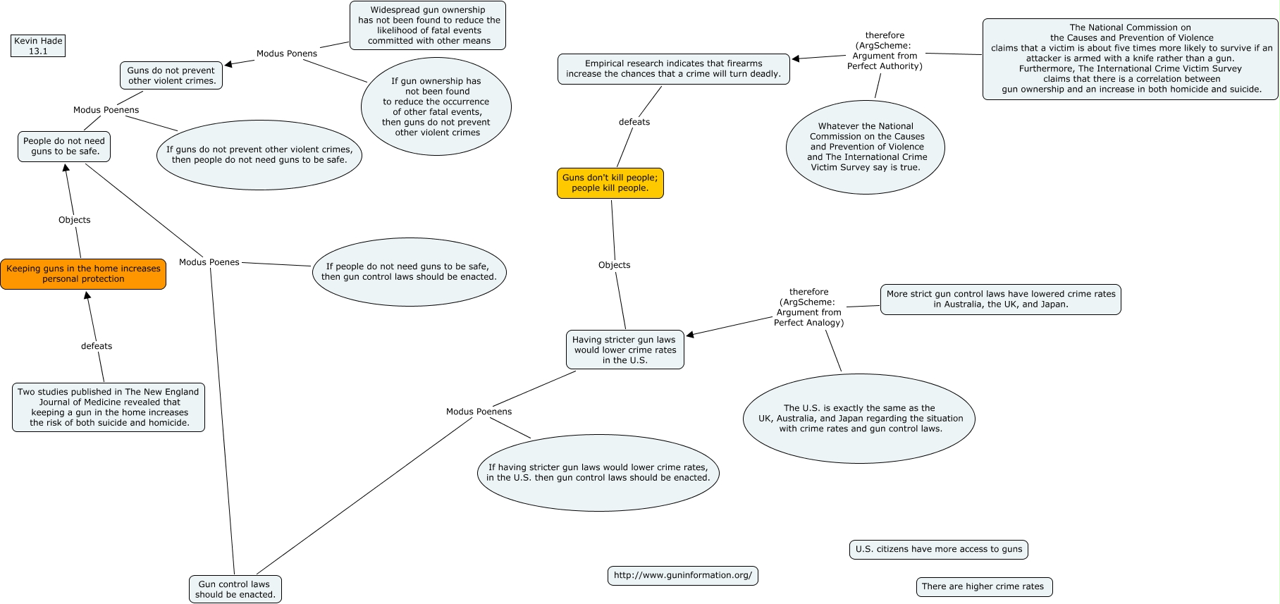 This Concept Map, created with IHMC CmapTools, has information related to: 13.1 - Kevin Hade, If people do not need guns to be safe, then gun control laws should be enacted. Modus Poenes Gun control laws should be enacted., Keeping guns in the home increases personal protection Objects People do not need guns to be safe., If having stricter gun laws would lower crime rates, in the U.S. then gun control laws should be enacted. Modus Poenens Gun control laws should be enacted., If guns do not prevent other violent crimes, then people do not need guns to be safe. Modus Poenens People do not need guns to be safe., Guns do not prevent other violent crimes. Modus Poenens People do not need guns to be safe., Whatever the National Commission on the Causes and Prevention of Violence and The International Crime Victim Survey say is true. therefore (ArgScheme: Argument from Perfect Authority) Empirical research indicates that firearms increase the chances that a crime will turn deadly., If gun ownership has not been found to reduce the occurrence of other fatal events, then guns do not prevent other violent crimes Modus Ponens Guns do not prevent other violent crimes., Widespread gun ownership has not been found to reduce the likelihood of fatal events committed with other means Modus Ponens Guns do not prevent other violent crimes., The U.S. is exactly the same as the UK, Australia, and Japan regarding the situation with crime rates and gun control laws. therefore (ArgScheme: Argument from Perfect Analogy) Having stricter gun laws would lower crime rates in the U.S., More strict gun control laws have lowered crime rates in Australia, the UK, and Japan. therefore (ArgScheme: Argument from Perfect Analogy) Having stricter gun laws would lower crime rates in the U.S., Having stricter gun laws would lower crime rates in the U.S. Modus Poenens Gun control laws should be enacted., Two studies published in The New England Journal of Medicine revealed that keeping a gun in the home increases the risk of both suicide and homicide. defeats Keeping guns in the home increases personal protection, The National Commission on the Causes and Prevention of Violence claims that a victim is about five times more likely to survive if an attacker is armed with a knife rather than a gun. Furthermore, The International Crime Victim Survey claims that there is a correlation between gun ownership and an increase in both homicide and suicide. therefore (ArgScheme: Argument from Perfect Authority) Empirical research indicates that firearms increase the chances that a crime will turn deadly., Guns don't kill people; people kill people. Objects Having stricter gun laws would lower crime rates in the U.S., People do not need guns to be safe. Modus Poenes Gun control laws should be enacted., Empirical research indicates that firearms increase the chances that a crime will turn deadly. defeats Guns don't kill people; people kill people.