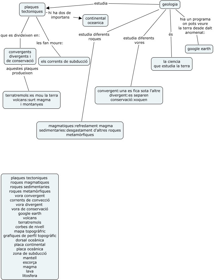 Este Cmap, tiene información relacionada con: geologia, geologia hia un programa on pots veure la terra desde dalt anomenat: google earth, geologia estudia diferents roques magmatiques:refredament magma sedimentaries:desgastament d'altres roques metamòrfiques, geologia és la ciencia que estudia la terra, geologia estudia diferents vores convergent:una es fica sota l'altre divergent:es separen conservació:xoquen, plaques tectoniques les fan moure: els corrents de subducció, plaques tectoniques hi ha dos de importans continental oceanica, plaques tectoniques que es divideixen en: convergents divergents i de conservació, convergents divergents i de conservació aquestes plaques produeixen terratremols:es mou la terra volcans:surt magma i montanyes, geologia estudia plaques tectoniques