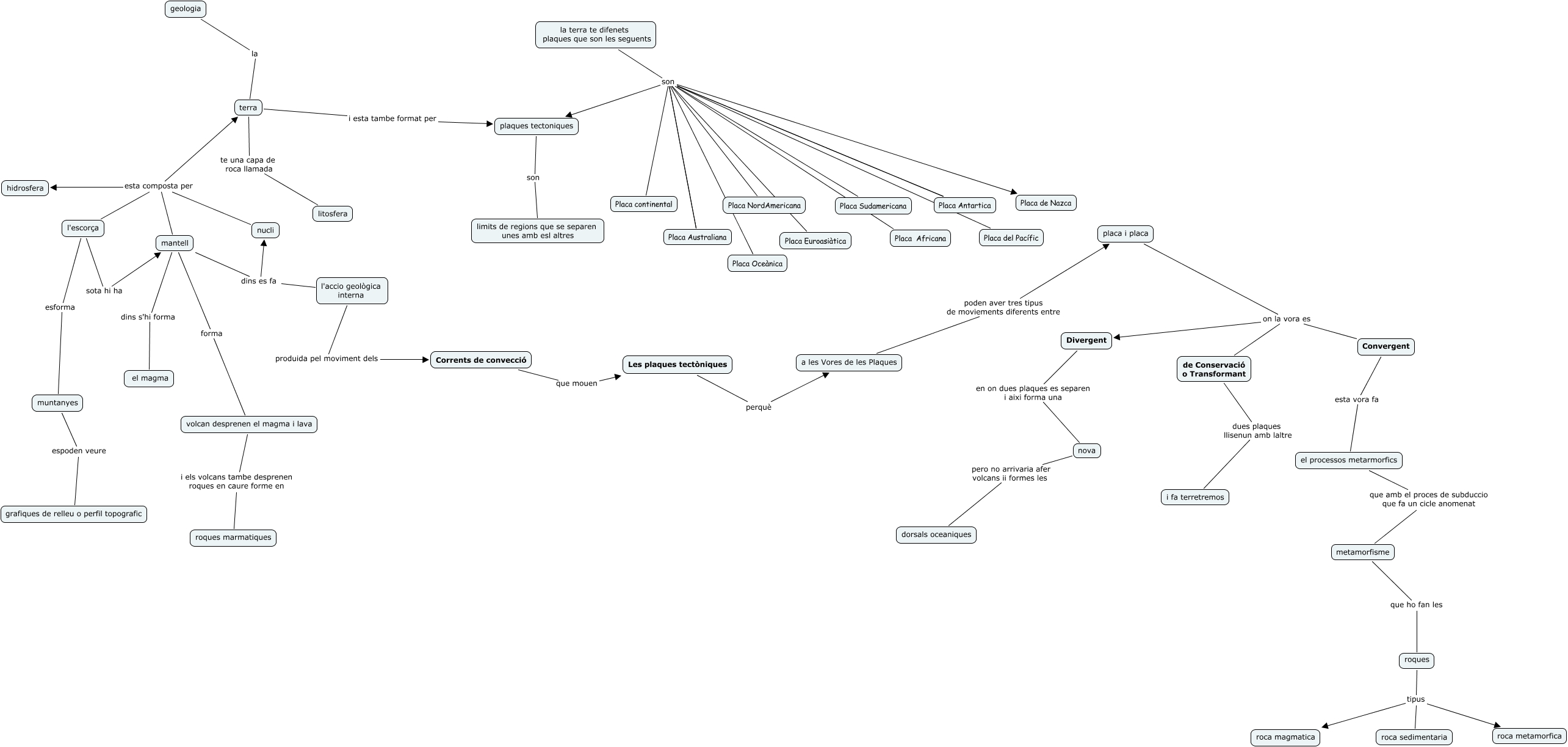 Este Cmap, tiene información relacionada con: geologia, la terra te difenets plaques que son les seguents son Placa Australiana, l'accio geològica interna dins es fa nucli, la terra te difenets plaques que son les seguents son Placa de Nazca, terra i esta tambe format per plaques tectoniques, roques tipus roca sedimentaria, la terra te difenets plaques que son les seguents son Placa Antartica, l'escorça sota hi ha mantell, muntanyes espoden veure grafiques de relleu o perfil topografic, Convergent esta vora fa el processos metarmorfics, Convergent on la vora es de Conservació o Transformant, l'escorça esta composta per terra, la terra te difenets plaques que son les seguents son Placa del Pacífic, terra te una capa de roca llamada litosfera, la terra te difenets plaques que son les seguents son Placa Australiana, la terra te difenets plaques que son les seguents son Placa Euroasiàtica, la terra te difenets plaques que son les seguents son Placa Africana, a les Vores de les Plaques poden aver tres tipus de moviements diferents entre placa i placa, metamorfisme que ho fan les roques, plaques tectoniques son limits de regions que se separen unes amb esl altres, mantell esta composta per nucli