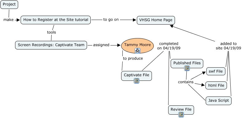 This Concept Map, created with IHMC CmapTools, has information related to: How to Register at the Site, How to Register at the Site tutorial to go on VHSG Home Page, Captivate File completed on 04/19/09 Review File, Published Files contains swf File, Java Script added to site 04/19/09 VHSG Home Page, Published Files contains Java Script, html File added to site 04/19/09 VHSG Home Page, swf File added to site 04/19/09 VHSG Home Page, Screen Recordings: Captivate Team assigned Tammy Moore, Published Files contains html File, Tammy Moore to produce Captivate File, How to Register at the Site tutorial tools Screen Recordings: Captivate Team, Project make How to Register at the Site tutorial, Captivate File completed on 04/19/09 Published Files