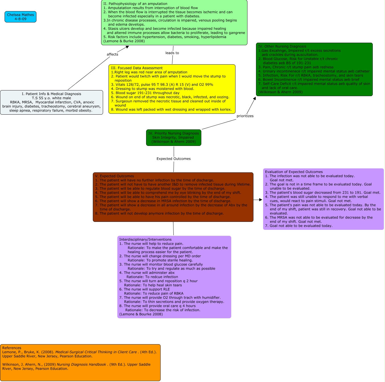 This Concept Map, created with IHMC CmapTools, has information related to: graded 3, V. Expected Outcomes 1. The patient will have no further infection by the time of discharge. 2. The patient will not have to have another I&D to remove infected tissue during lifetime. 3. The patient will be able to regulate blood sugar by the time of discharge. 4. The patient will be able to comprehend me by eye blinking by the end of my shift. 5. The patient will be able to have his pain controlled by the time of discharge. 6. The patient will show a decrease in MRSA infection by the time of discharge. 7. The patient will show a decrease in all around infection by the decrease of Abx by the time of discharge. 8. The patient will not develop anymore infection by the time of discharge. ???? Interdisciplinary/Interventions 1. The nurse will help to reduce pain. Rationale: To make the patient comfortable and make the healing process easier for the patient. 2. The nurse will change dressing per MD order Rationale: To promote sterile healing. 3. The nurse will monitor blood glucose carefully Rationale: To try and regulate as much as possible 4. The nurse will administer abx Rationale: To redcue infection 5. The nurse will turn and reposition q 2 hour Rationale: To help heal skin tears 6. The nurse will support RLE Rationale: To reduce pain of RBKA 7. The nurse will provide O2 through trach with humidifier. Rationale: To thin secretions and provide oxygen therapy. 8. The nurse will provide oral care q 4 hours Rationale: To decrease the risk of infection. (Lemone & Bourke 2008), I. Patient Info & Medical Diagnosis T.S 55 y.o. white male RBKA, MRSA, Myocardial infarction, CVA, anoxic brain injury, diabetes, tracheostomy, cerebral aneurysm, sleep apnea, respiratory failure, morbid obesity. affects II. Pathophysiology of an amputation 1. Amputatation results from interruption of blood flow 2. When the blood flow is interrupted the tissue becomes ischemic and can become infected especially in a patient with diabetes. 3.In chronic disease processes, circulation is impaired, venous pooling begins and edema develops. 4. Stasis ulcers develop and become infected because impaired healing and altered immune processes allow bacteria to proliferate, leading to gangrene 5. Risk factors include hypertension, diabetes, smoking, hyperlipidemia (Lemone & Burke 2008), V. Expected Outcomes 1. The patient will have no further infection by the time of discharge. 2. The patient will not have to have another I&D to remove infected tissue during lifetime. 3. The patient will be able to regulate blood sugar by the time of discharge. 4. The patient will be able to comprehend me by eye blinking by the end of my shift. 5. The patient will be able to have his pain controlled by the time of discharge. 6. The patient will show a decrease in MRSA infection by the time of discharge. 7. The patient will show a decrease in all around infection by the decrease of Abx by the time of discharge. 8. The patient will not develop anymore infection by the time of discharge. ???? Evaluation of Expected Outcomes 1. The infection was not able to be evaluated today. Goal not met. 2. The goal is not in a time frame to be evaluated today. Goal unable to be evaluated. 3. The patient's blood sugar decreased from 231 to 191. Goal met. 4. The patient was still unable to respond to me with verbal cues, would react to pain stimuli. Goal not met. 5. The patient's pain was not able to be evaluated today. By the end of my shift, patient was still in recovery. Goal not able to be evaluated. 6. The MRSA was not able to be evaluated for decrease by the end of my shift. Goal not met. 7. Goal not able to be evaluated today., IV. Priority Nursing Diagnosis Skin Integrity, Impaired (Wilkinson & Ahern 2009) prioritizes IV. Other Nursing Diagnosis 1.Gas Excahnge, Impaired r/t excess secretions aeb crackles during auscultation. 2. Blood Glucose, Risk for Unstable r/t chronic diabetes aeb BS of 191-231 3. Pain, Chronic r/t stump pain aeb redness 4. Urinary incontinenece r/t impaired mental status aeb catheter 5. Infection, Risk For r/t RBKA, tracheostomy, and skin tears 6. Bowel Incontinence r/t impaired mental status aeb brief 7. Self-Care Deficit r/t impaired mental status aeb quality of skin and lack of oral care. (Wilkinson & Ahern 2009), IV. Priority Nursing Diagnosis Skin Integrity, Impaired (Wilkinson & Ahern 2009) Expected Outcomes V. Expected Outcomes 1. The patient will have no further infection by the time of discharge. 2. The patient will not have to have another I&D to remove infected tissue during lifetime. 3. The patient will be able to regulate blood sugar by the time of discharge. 4. The patient will be able to comprehend me by eye blinking by the end of my shift. 5. The patient will be able to have his pain controlled by the time of discharge. 6. The patient will show a decrease in MRSA infection by the time of discharge. 7. The patient will show a decrease in all around infection by the decrease of Abx by the time of discharge. 8. The patient will not develop anymore infection by the time of discharge., II. Pathophysiology of an amputation 1. Amputatation results from interruption of blood flow 2. When the blood flow is interrupted the tissue becomes ischemic and can become infected especially in a patient with diabetes. 3.In chronic disease processes, circulation is impaired, venous pooling begins and edema develops. 4. Stasis ulcers develop and become infected because impaired healing and altered immune processes allow bacteria to proliferate, leading to gangrene 5. Risk factors include hypertension, diabetes, smoking, hyperlipidemia (Lemone & Burke 2008) leads to III. Focused Data Assessment 1.Right leg was red near area of amputation 2. Patient would twitch with pain when I would move the stump to reposition 3. Vitals 128/72, pulse 95 T 98.3 (A) R 15 (V) and O2 99% 4. Dressing to stump was moistened with blood. 5. Blood sugar 191-231 throughout day 6. Wou