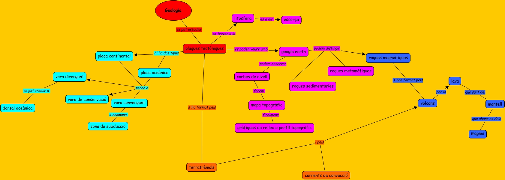 Este Cmap, tiene información relacionada con: mapa conceptual de geologia, google earth podem distingir roques metamófiques, roques magmàtiques s'han format pels volcans, google earth podem observar corbes de nivell, volcans per la lava, terratrèmols i pels corrents de convecció, plaques tectòniques es troven a la litosfera, vora convergent s'anomena zona de subducció, google earth podem distingir roques magmàtiques, corbes de nivell farem mapa topogràfic, litosfera es a dir escorça, placa continental tenen o vora de conservació, placa continental tenen o vora divergent, placa oceànica tenen o vora convergent, plaques tectòniques es poden veure amb google earth, vora divergent es pot trobar a dorsal oceànica, plaques tectòniques hi ha dos tipus placa oceànica, placa oceànica tenen o vora de conservació, placa oceànica tenen o vora divergent, terratrèmols i pels volcans, Geologia es pot estudiar plaques tectòniques