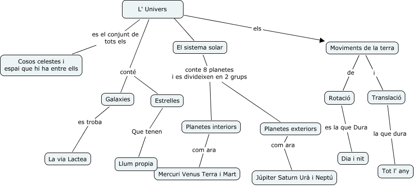 Este Cmap, tiene información relacionada con: Recuperacio 2n Eso Esquema del Univers, Translació la que dura Tot l' any, Planetes interiors com ara Mercuri Venus Terra i Mart, Moviments de la terra i Translació, El sistema solar conte 8 planetes i es divideixen en 2 grups Planetes interiors, Rotació es la que Dura Dia i nit, Estrelles Que tenen Llum propia, Galaxies es troba La via Lactea, Moviments de la terra de Rotació, L' Univers els Moviments de la terra, El sistema solar conte 8 planetes i es divideixen en 2 grups Planetes exteriors, L' Univers es el conjunt de tots els Cosos celestes i espai que hi ha entre ells, L' Univers conté Estrelles, Planetes exteriors com ara Júpiter Saturn Urà i Neptú, L' Univers conté Galaxies, L' Univers ???? El sistema solar