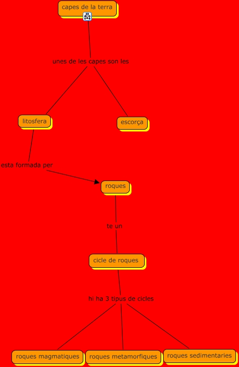 Este mapa conceptual tiene información relacionada a: capes, roques te un cicle de roques, capes de la terra unes de les capes son les litosfera, litosfera esta formada per roques, cicle de roques hi ha 3 tipus de cicles roques magmatiques, capes de la terra unes de les capes son les escorça, cicle de roques hi ha 3 tipus de cicles roques metamorfiques, cicle de roques hi ha 3 tipus de cicles roques sedimentaries