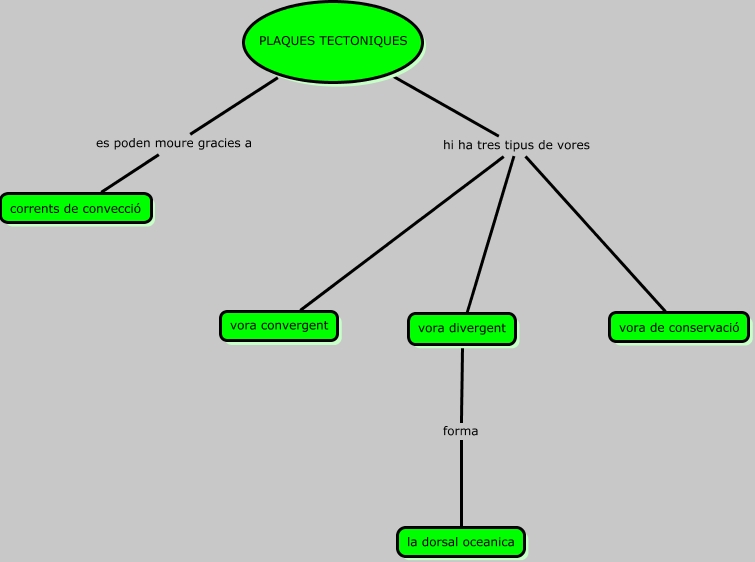 Este mapa conceptual tiene información relacionada a: plaques tectoniques, vora divergent forma la dorsal oceanica, PLAQUES TECTONIQUES es poden moure gracies a corrents de convecció, PLAQUES TECTONIQUES hi ha tres tipus de vores vora divergent, PLAQUES TECTONIQUES hi ha tres tipus de vores vora de conservació, PLAQUES TECTONIQUES hi ha tres tipus de vores vora convergent