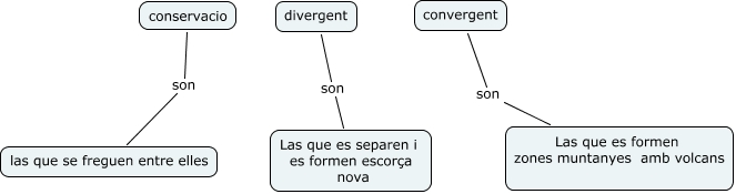Este Cmap, tiene información relacionada con: a, divergent son Las que es separen i es formen escorça nova, conservacio son las que se freguen entre elles, convergent son Las que es formen zones muntanyes amb volcans