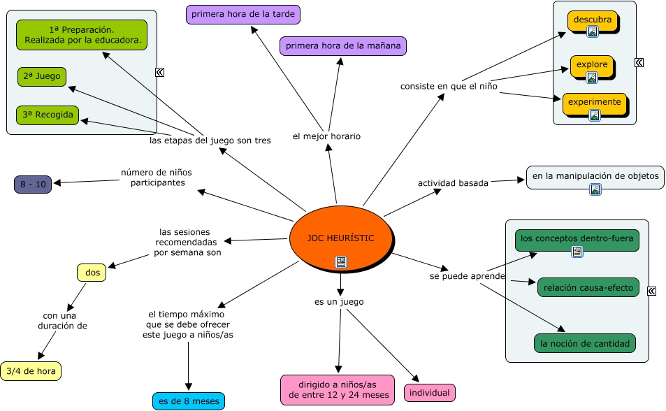 Este Cmap, tiene información relacionada con: mapa concep. juego heuristico, JOC HEURÍSTIC las etapas del juego son tres 3ª Recogida, JOC HEURÍSTIC se puede aprender los conceptos dentro-fuera, JOC HEURÍSTIC las etapas del juego son tres 2ª Juego, JOC HEURÍSTIC actividad basada en la manipulación de objetos, JOC HEURÍSTIC las etapas del juego son tres 1ª Preparación. Realizada por la educadora., JOC HEURÍSTIC el mejor horario primera hora de la tarde, JOC HEURÍSTIC número de niños participantes 8 - 10, JOC HEURÍSTIC el mejor horario primera hora de la mañana, JOC HEURÍSTIC el tiempo máximo que se debe ofrecer este juego a niños/as es de 8 meses, dos con una duración de 3/4 de hora, JOC HEURÍSTIC las sesiones recomendadas por semana son dos, JOC HEURÍSTIC consiste en que el niño experimente, JOC HEURÍSTIC es un juego individual, JOC HEURÍSTIC se puede aprender relación causa-efecto, JOC HEURÍSTIC consiste en que el niño descubra, JOC HEURÍSTIC se puede aprender la noción de cantidad, JOC HEURÍSTIC consiste en que el niño explore, JOC HEURÍSTIC es un juego dirigido a niños/as de entre 12 y 24 meses