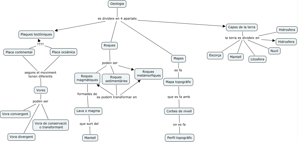 Este Cmap, tiene información relacionada con: Geologia 2, Roques sedimentàries es podem transformar en Roques magmàtiques, Vores poden ser Vora divergent, Roques poden ser Roques sedimentàries, Geologia es divideix en 4 apartats Capes de la terra, Capes de la terra la terra es divideix en Escorça, Hidrosfera la terra es divideix en Escorça, Lava o magma que surt del Mantell, Geologia es divideix en 4 apartats Roques, Roques poden ser Roques metàmorfiques, Placa continental ???? Plaques tectòniques, Mapes es fa Mapa topogràfic, Placa continental ???? Plaques tectòniques, Placa oceànica ???? Plaques tectòniques, Capes de la terra la terra es divideix en Nucli, Placa oceànica ???? Plaques tectòniques, Placa continental segons el moviment tenen diferents Vores, Mapa topogràfic que es fa amb Corbes de nivell, Hidrosfera la terra es divideix en Hidrosfera, Vores poden ser Vora de conservació o transformant, Hidrosfera la terra es divideix en Nucli