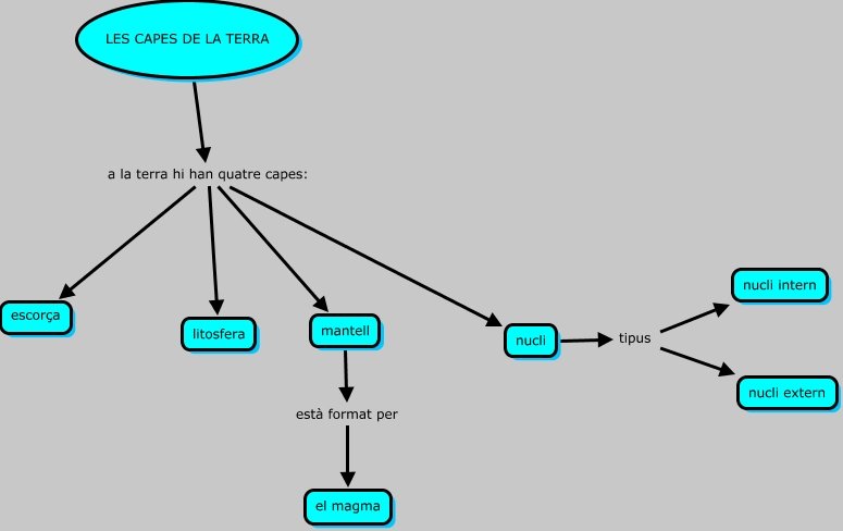 Este mapa conceptual tiene información relacionada a: les capes de la terra, LES CAPES DE LA TERRA a la terra hi han quatre capes: escorça, mantell està format per el magma, nucli tipus nucli intern, LES CAPES DE LA TERRA a la terra hi han quatre capes: nucli, nucli tipus nucli extern, LES CAPES DE LA TERRA a la terra hi han quatre capes: litosfera, LES CAPES DE LA TERRA a la terra hi han quatre capes: mantell