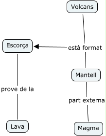 Este mapa conceptual tiene información relacionada a: Volcans, Volcans està format Mantell, Volcans està format Escorça, Escorça prove de la Lava, Mantell part externa Magma