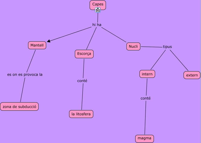 Este Cmap, tiene información relacionada con: capes, Capes hi ha Nucli, Nucli tipus intern, Mantell es on es provoca la zona de subducció, Capes hi ha Escorça, Escorça conté la litosfera, Nucli tipus extern, Capes hi ha Mantell, intern conté magma