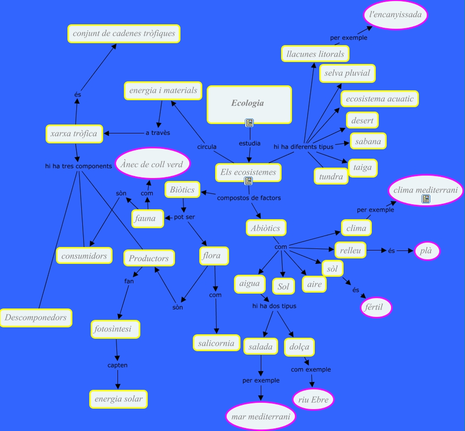 Este Cmap, tiene información relacionada con: Ecologia, xarxa tròfica hi ha tres components consumidors, aigua hi ha dos tipus salada, xarxa tròfica és conjunt de cadenes tròfiques, Els ecosistemes hi ha diferents tipus desert, Abiòtics com clima, sòl és fértil, salada per exemple mar mediterrani, Els ecosistemes hi ha diferents tipus sabana, flora sòn Productors, relleu és plà, Els ecosistemes hi ha diferents tipus taiga, Abiòtics com aire, fauna sòn consumidors, Els ecosistemes compostos de factors Abiòtics, Abiòtics com sòl, fauna com Ànec de coll verd, Abiòtics com Sol, Productors fan fotosìntesi, fotosìntesi capten energia solar, dolça com exemple riu Ebre