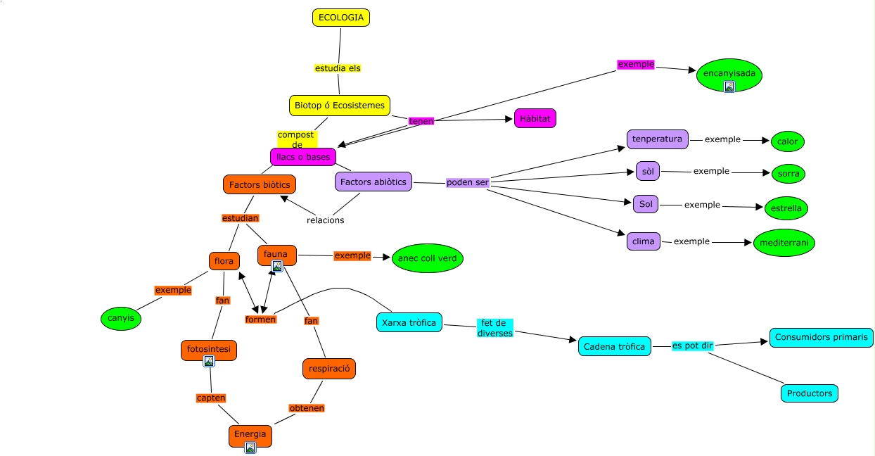 Este Cmap, tiene información relacionada con: Ecologia, flora exemple canyis, llacs o bases exemple encanyisada, Biotop ó Ecosistemes compost de factors Factors biòtics, fauna formen Xarxa tròfica, fauna formen flora, Biotop ó Ecosistemes compost de factors Factors abiòtics, Factors abiòtics poden ser sòl, Factors abiòtics relacions Factors biòtics, fotosintesi capten Energia, Cadena tròfica es pot dir Consumidors primaris, fauna fan respiració, Factors biòtics estudian flora, Factors abiòtics poden ser tenperatura, fauna exemple anec coll verd, Factors abiòtics poden ser clima, Factors biòtics estudian fauna, sòl exemple sorra, Sol exemple estrella, tenperatura exemple calor, ECOLOGIA estudia els Biotop ó Ecosistemes