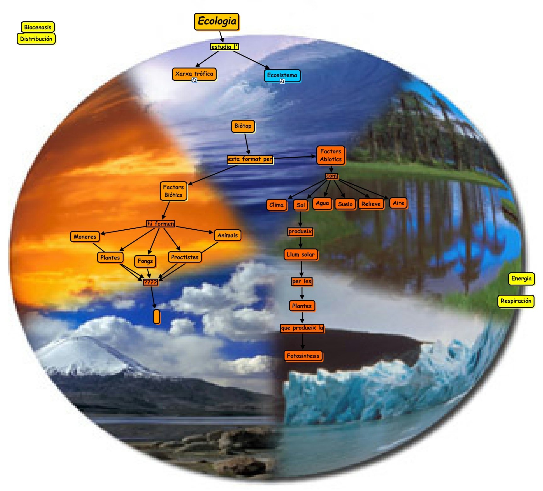 Este Cmap, tiene información relacionada con: Ecologia, Moneres ????, Factors Abiotics com Agua, Ecologia estudia l' Ecosistema, Animals ????, Plantes que produeix la Fotosintesis, Factors Abiotics com Suelo, Biòtop esta format per Factors Abiotics, Plantes ????, Sol produeix Llum solar, Factors Abiotics com Sol, Factors Biótics hi formen Moneres, Factors Abiotics com Relieve, Ecologia estudia l' Xarxa tròfica, Biòtop esta format per Factors Biótics, Factors Biótics hi formen Animals, Proctistes ????, Factors Biótics hi formen Proctistes, Factors Abiotics com Clima, Fongs ????, Factors Abiotics com Aire
