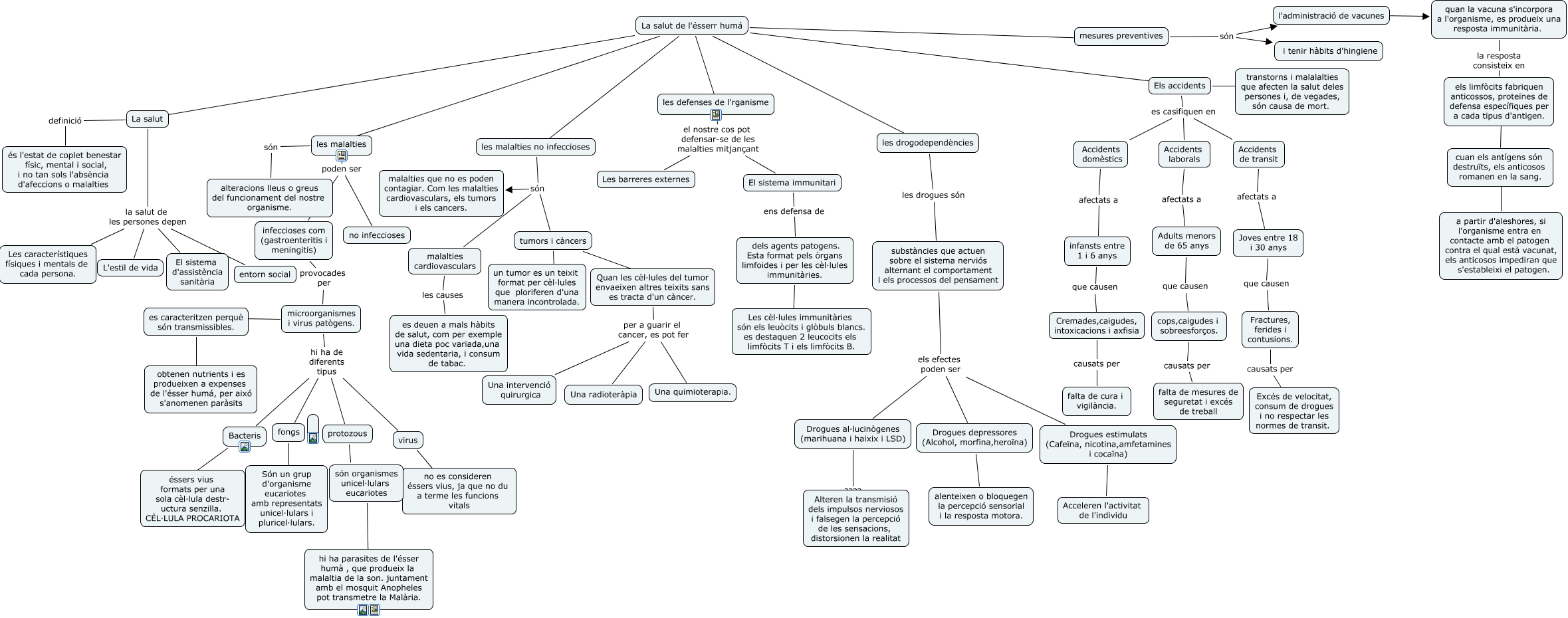 Este Cmap, tiene información relacionada con: la salut, La salut de l'ésserr humá ???? Els accidents, substàncies que actuen sobre el sistema nerviós alternant el comportament i els processos del pensament els efectes poden ser Drogues estimulats (Cafeïna, nicotina,amfetamines i cocaïna), Drogues estimulats (Cafeïna, nicotina,amfetamines i cocaïna) ???? Acceleren l'activitat de l'individu, quan la vacuna s'incorpora a l'organisme, es produeix una resposta immunitària. la resposta consisteix en els limfòcits fabriquen anticossos, proteïnes de defensa específiques per a cada tipus d'antigen., les defenses de l'rganisme el nostre cos pot defensar-se de les malalties mitjançant El sistema immunitari, Adults menors de 65 anys que causen cops,caigudes i sobreesforços., les malalties són alteracions lleus o greus del funcionament del nostre organisme., La salut la salut de les persones depen Les característiques físiques i mentals de cada persona., malalties cardiovasculars les causes es deuen a mals hàbits de salut, com per exemple una dieta poc variada,una vida sedentaria, i consum de tabac., microorganismes i virus patògens. hi ha de diferents tipus virus, mesures preventives són l'administració de vacunes, infeccioses com (gastroenteritis i meningitis) provocades per microorganismes i virus patògens., tumors i càncers ???? un tumor es un teixit format per cèl·lules que ploriferen d'una manera incontrolada., La salut de l'ésserr humá ???? La salut, Joves entre 18 i 30 anys que causen Fractures, ferides i contusions., Els accidents es casifiquen en Accidents laborals, La salut la salut de les persones depen El sistema d'assistència sanitària, són organismes unicel·lulars eucariotes ???? hi ha parasites de l'ésser humà , que produeix la malaltia de la son. juntament amb el mosquit Anopheles pot transmetre la Malària., Accidents de transit afectats a Joves entre 18 i 30 anys, El sistema immunitari ens defensa de dels agents patogens. Esta format pels òrgans limfoides i per les cèl·lules immunitàries.