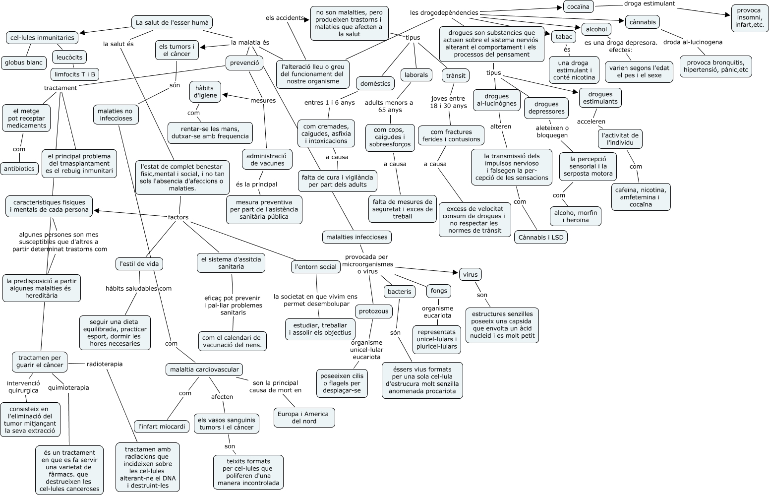 Este mapa conceptual tiene información relacionada a: La salut de l'ésser humà, malalties infeccioses provocada per microorganismes o virus virus, l'alteració lleu o greu del funcionament del nostre organisme les drogodepèndencies tabac, l'estat de complet benestar fisic,mental i social, i no tan sols l'absencia d'afeccions o malaties. factors l'estil de vida, domèstics entres 1 i 6 anys com cremades, caigudes, asfixia i intoxicacions, drogues depressores aleteixen o bloquegen la percepció sensorial i la serposta motora, tractamen per guarir el càncer intervenció quirurgica consisteix en l'eliminació del tumor mitjançant la seva extracció, caracteristiques fisiques i mentals de cada persona algunes persones son mes susceptibles que d'altres a partir determinat trastorns com la predisposició a partir algunes malalties és hereditària, l'estat de complet benestar fisic,mental i social, i no tan sols l'absencia d'afeccions o malaties. factors el sistema d'assitcia sanitaria, l'entorn social la societat en que vivim ens permet desembolupar estudiar, treballar i assolir els objectius, drogues estimulants acceleren l'activitat de l'individu, els tumors i el càncer són malaties no infeccioses, l'alteració lleu o greu del funcionament del nostre organisme les drogodepèndencies drogues son substancies que actuen sobre el sistema nerviós alterant el comportament i els processos del pensament, protozous organisme unicel-lular eucariota poseeixen cilis o flagels per desplaçar-se, el metge pot receptar medicaments com antibiotics, prevenció tractament el metge pot receptar medicaments, malaltia cardiovascular com l'infart miocardi, administració de vacunes és la principal mesura preventiva per part de l'asistència sanitària pública, drogues son substancies que actuen sobre el sistema nerviós alterant el comportament i els processos del pensament tipus drogues depressores, prevenció mesures administració de vacunes, la percepció sensorial i la serposta motora com alcoho, morfin i heroïna