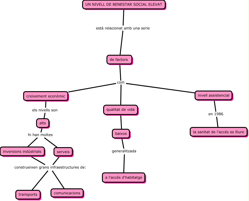 Este Cmap, tiene información relacionada con: socis, de factors com nivell assistencial, baixos ???? qualitat de vida, inversions indústrials construeixen grans infraestructures de: comunicacions, alts hi han moltes serveis, baixos generalitzada a l'accés d'habitatge, serveis construeixen grans infraestructures de: transports, alts hi han moltes inversions indústrials, creixement econòmic els nivells son alts, UN NIVELL DE BENESTAR SOCIAL ELEVAT està relacionat amb una serie de factors, de factors com creixement econòmic, nivell assistencial en 1986 la sanitat de l'accés es lliure, inversions indústrials construeixen grans infraestructures de: transports, de factors com qualitat de vida, serveis construeixen grans infraestructures de: comunicacions