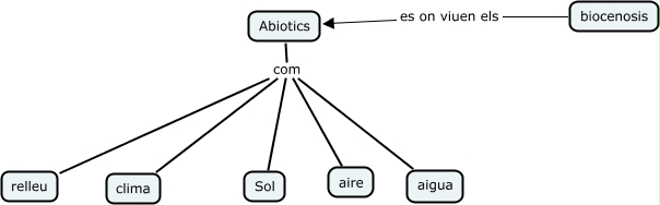 Este mapa conceptual tiene información relacionada a: abiotics, Abiotics com Sol, Abiotics com relleu, Abiotics com clima, biocenosis es on viuen els Abiotics, Abiotics com aigua, Abiotics com aire