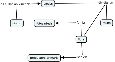Este mapa conceptual tiene información relacionada a: biotics, biòtop es el lloc on viuenels biótics, biótics dividits en fauna, flora son els productors primaris, biótics dividits en flora, flora fan la fotosíntesis