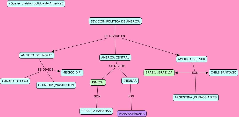 DIVISION POLITICA, ISMICA SON CUBA ,LA BAHAMAS, AMERICA CENTRAL SE DIVIDE INSULAR, INSULAR SON PANAMA.PANAMA, AMERICA DEL SUR SON BRASIL ,BRASILIA, AMERICA CENTRAL SE DIVIDE ISMICA, DIVICIÓN POLITICA DE AMERICA SE DIVIDE EN AMERICA CENTRAL, DIVICIÓN POLITICA DE AMERICA SE DIVIDE EN AMERICA DEL SUR, AMERICA DEL NORTE SE DIVIDE MEXICO D,F,, AMERICA DEL SUR SON ARGENTINA ,BUENOS AIRES, AMERICA DEL NORTE SE DIVIDE CANADA OTTAWA