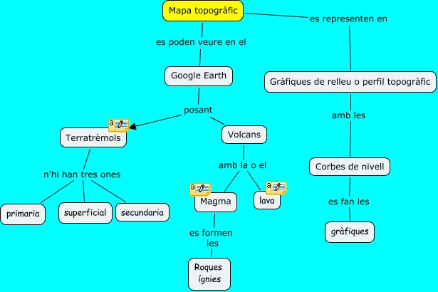 Este Cmap, tiene información relacionada con: mapes, Mapa topogràfic es representen en Gràfiques de relleu o perfil topogràfic, Mapa topogràfic es poden veure en el Google Earth, Gràfiques de relleu o perfil topogràfic amb les Corbes de nivell, Volcans amb la o el Magma, Volcans amb la o el lava, Magma es formen les Roques ígnies, Terratrèmols n'hi han tres ones superficial, Corbes de nivell es fan les gràfiques, Google Earth posant Terratrèmols, Google Earth posant Volcans, Terratrèmols n'hi han tres ones secundaria, Terratrèmols n'hi han tres ones primaria