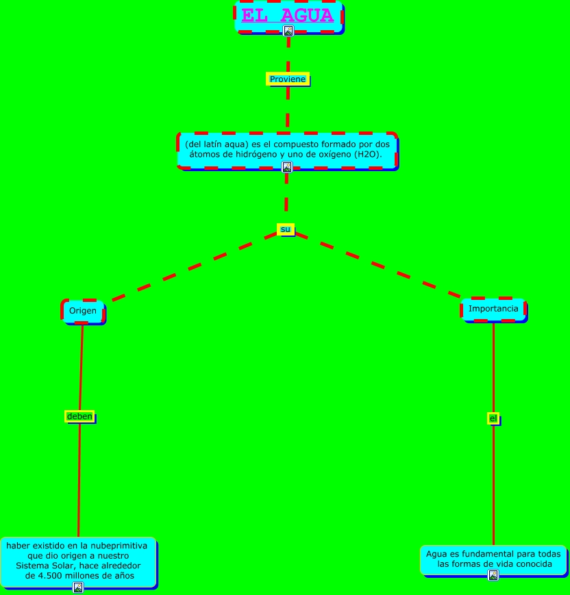 Este Cmap, tiene información relacionada con: EL AGUA, (del latín aqua) es el compuesto formado por dos átomos de hidrógeno y uno de oxígeno (H2O). su Importancia, (del latín aqua) es el compuesto formado por dos átomos de hidrógeno y uno de oxígeno (H2O). su Origen, Importancia el Agua es fundamental para todas las formas de vida conocida, EL AGUA Proviene (del latín aqua) es el compuesto formado por dos átomos de hidrógeno y uno de oxígeno (H2O)., Origen deben haber existido en la nubeprimitiva que dio origen a nuestro Sistema Solar, hace alrededor de 4.500 millones de años