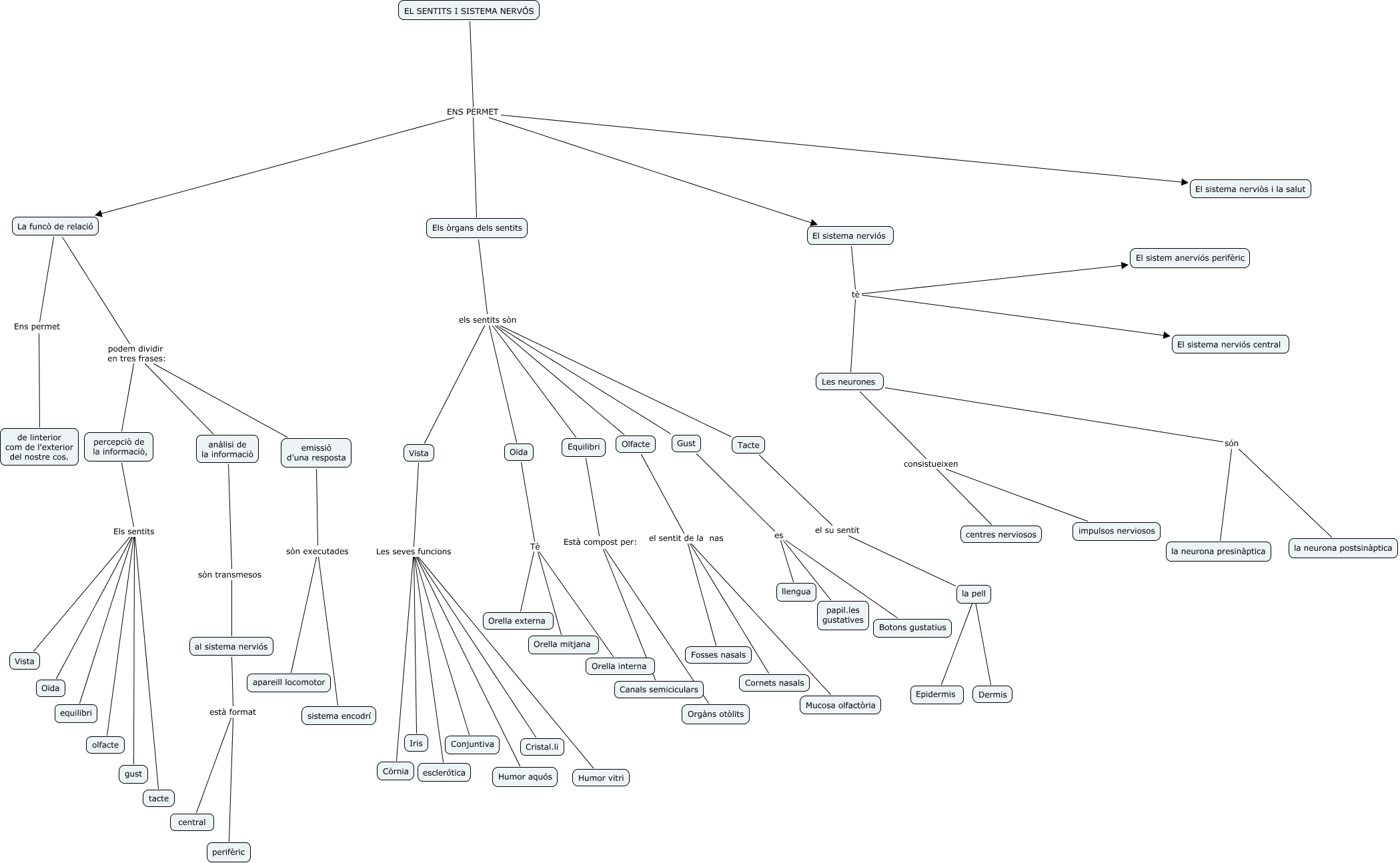Aquest mapa conceptual conté informació relacionada amb: funciò de relaciò, La funcò de relació podem dividir en tres frases: anàlisi de la informaciò, Vista Les seves funcions Humor aquós, la pell ???? Dermis, La funcò de relació podem dividir en tres frases: emissiò d'una resposta, percepciò de la informaciò, Els sentits Oïda, El sistema nerviós tè Les neurones, Les neurones són la neurona postsinàptica, La funcò de relació podem dividir en tres frases: percepciò de la informaciò,, Oïda Tè Orella interna, La funcò de relació Ens permet de linterior com de l'exterior del nostre cos., EL SENTITS I SISTEMA NERVÓS ENS PERMET La funcò de relació, Gust es Botons gustatius, Olfacte el sentit de la nas Fosses nasals, Olfacte el sentit de la nas Mucosa olfactòria, percepciò de la informaciò, Els sentits tacte, Oïda Tè Orella externa, emissiò d'una resposta sòn executades apareill locomotor, percepciò de la informaciò, Els sentits olfacte, EL SENTITS I SISTEMA NERVÓS ENS PERMET El sistema nerviòs i la salut, Els òrgans dels sentits els sentits sòn Vista