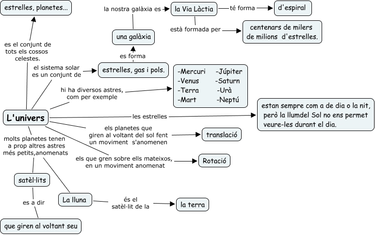 Este Cmap, tiene información relacionada con: univers, L'univers els planetes que giren al voltant del sol fent un moviment s'anomenen translació, la Via Làctia té forma d'espiral, L'univers els que gren sobre ells mateixos, en un moviment anomenat Rotació, L'univers molts planetes tenen a prop altres astres més petits,anomenats La lluna, la Via Làctia està formada per centenars de milers de milions d'estrelles., una galàxia la nostra galàxia es la Via Làctia, L'univers es el conjunt de tots els cossos celestes. estrelles, planetes..., La lluna és el satèl·lit de la la terra, L'univers molts planetes tenen a prop altres astres més petits,anomenats satèl·lits, L'univers les estrelles estan sempre com a de dia o la nit, però la llumdel Sol no ens permet veure-les durant el dia., estrelles, gas i pols. es forma una galàxia, satèl·lits es a dir que giren al voltant seu, L'univers el sistema solar es un conjunt de estrelles, gas i pols., L'univers hi ha diversos astres, com per exemple -Mercuri -Júpiter -Venus -Saturn -Terra -Urà -Mart -Neptú, estrelles, gas i pols. es forma una galàxia