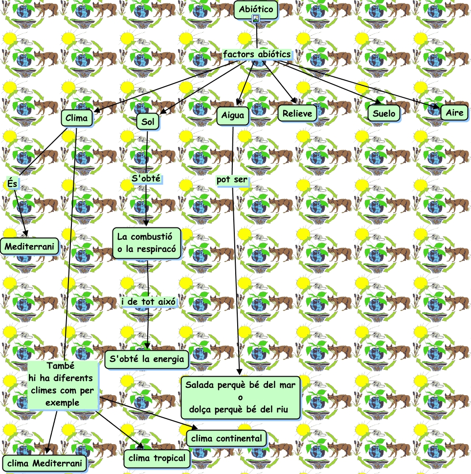 Este Cmap, tiene información relacionada con: abiótico, Sol S'obté La combustió o la respiracó, Abiótico factors abiótics Suelo, Clima També hi ha diferents climes com per exemple clima Mediterrani, Aigua pot ser Salada perquè bé del mar o dolça perquè bé del riu, Abiótico factors abiótics Aigua, Abiótico factors abiótics Sol, Clima També hi ha diferents climes com per exemple clima continental, La combustió o la respiracó i de tot aixó S'obté la energia, Clima És Mediterrani, Abiótico factors abiótics Clima, Abiótico factors abiótics Aire, Clima També hi ha diferents climes com per exemple clima tropical, Abiótico factors abiótics Relieve