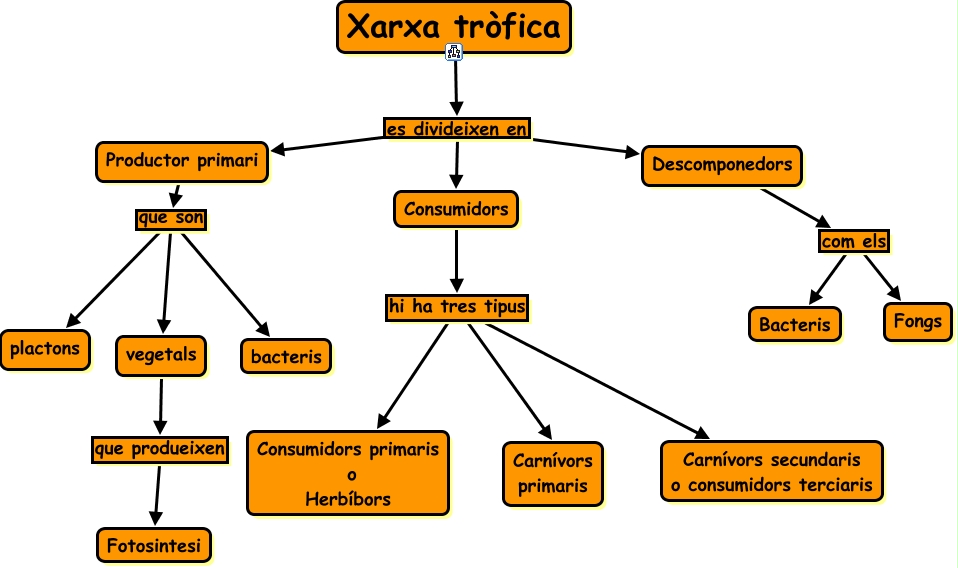 Este Cmap, tiene información relacionada con: Xarxa tròfica, Descomponedors com els Bacteris, Descomponedors com els Fongs, Xarxa tròfica es divideixen en Consumidors, Productor primari que son plactons, Consumidors hi ha tres tipus Carnívors secundaris o consumidors terciaris, Productor primari que son vegetals, vegetals que produeixen Fotosintesi, Xarxa tròfica es divideixen en Descomponedors, Xarxa tròfica es divideixen en Productor primari, Productor primari que son bacteris, Consumidors hi ha tres tipus Consumidors primaris o Herbíbors, Consumidors hi ha tres tipus Carnívors primaris