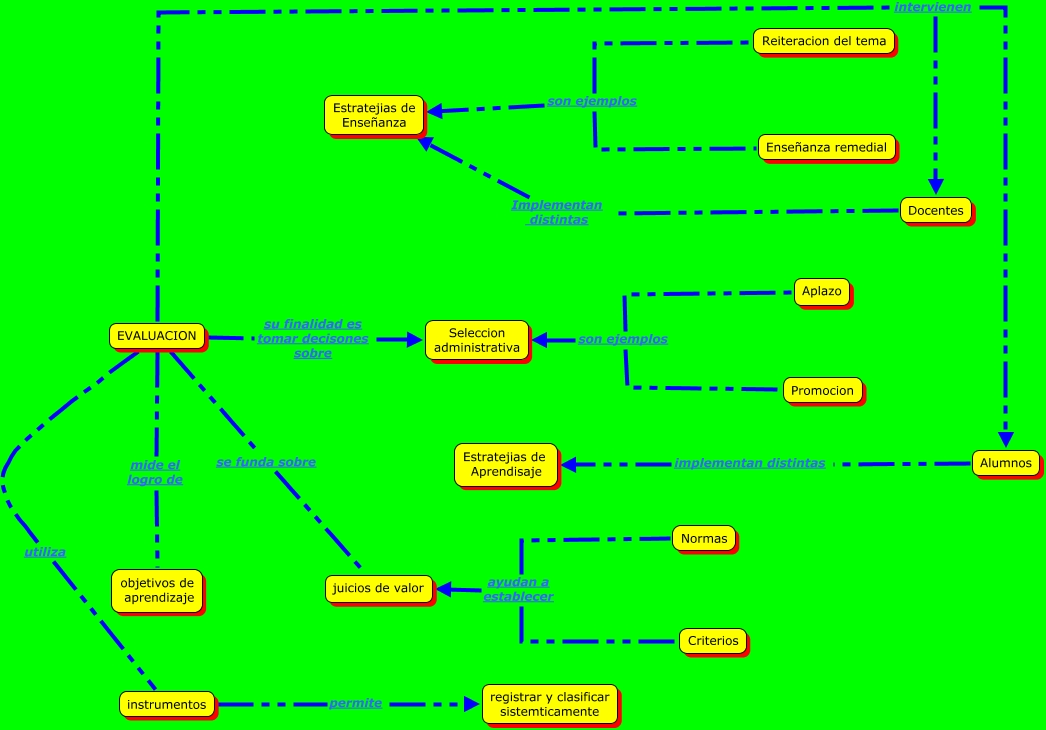 Este Cmap, tiene información relacionada con: richard y vidal, EVALUACION utiliza instrumentos, EVALUACION intervienen Docentes, Docentes Implementan distintas Estratejias de Enseñanza, Alumnos implementan distintas Estratejias de Aprendisaje, instrumentos permite registrar y clasificar sistemticamente, EVALUACION su finalidad es tomar decisones sobre Seleccion administrativa, EVALUACION se funda sobre juicios de valor, EVALUACION mide el logro de objetivos de aprendizaje, EVALUACION intervienen Alumnos