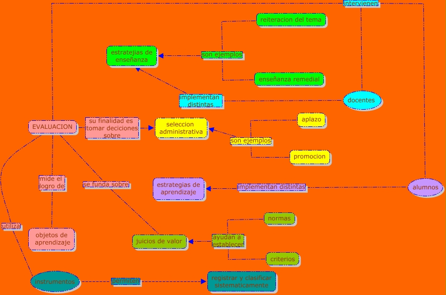 Este Cmap, tiene información relacionada con: zobeida y Ruby, EVALUACION mide el logro de objetos de aprendizaje, EVALUACION intervienen alumnos, EVALUACION su finalidad es tomar deciciones sobre seleccion administrativa, instrumentos permiten registrar y clasificar sistematicamente, EVALUACION intervienen docentes, enseñanza remedial son ejemplos estratejias de enseñanza, docentes implementan distintas estratejias de enseñanza, normas ayudan a establecer juicios de valor, reiteracion del tema son ejemplos estratejias de enseñanza, criterios ayudan a establecer juicios de valor, EVALUACION se funda sobre juicios de valor, alumnos implementan distintas estrategias de aprendizaje, promocion son ejemplos seleccion administrativa, EVALUACION utiliza instrumentos, aplazo son ejemplos seleccion administrativa