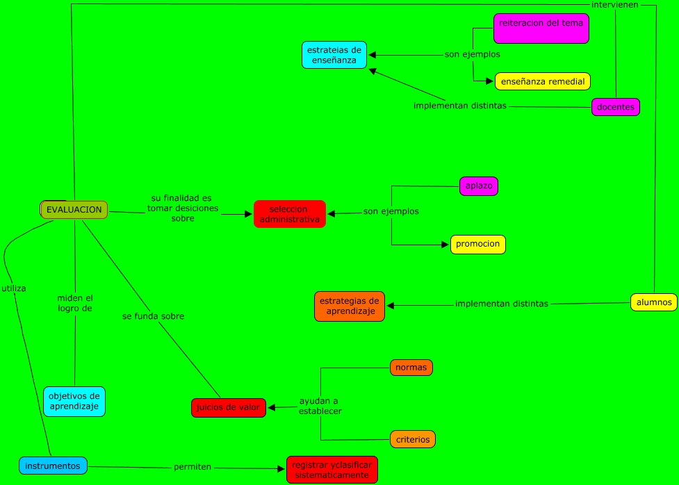 Este Cmap, tiene información relacionada con: kleischman, alumnos implementan distintas estrategias de aprendizaje, normas ayudan a establecer juicios de valor, criterios ayudan a establecer juicios de valor, instrumentos permiten registrar yclasificar sistematicamente, EVALUACION su finalidad es tomar desiciones sobre seleccion administrativa, reiteracion del tema son ejemplos estrateias de enseñanza, EVALUACION utiliza instrumentos, EVALUACION miden el logro de objetivos de aprendizaje, aplazo son ejemplos promocion, aplazo son ejemplos seleccion administrativa, docentes implementan distintas estrateias de enseñanza, reiteracion del tema son ejemplos enseñanza remedial, EVALUACION se funda sobre juicios de valor, EVALUACION intervienen alumnos, EVALUACION intervienen docentes