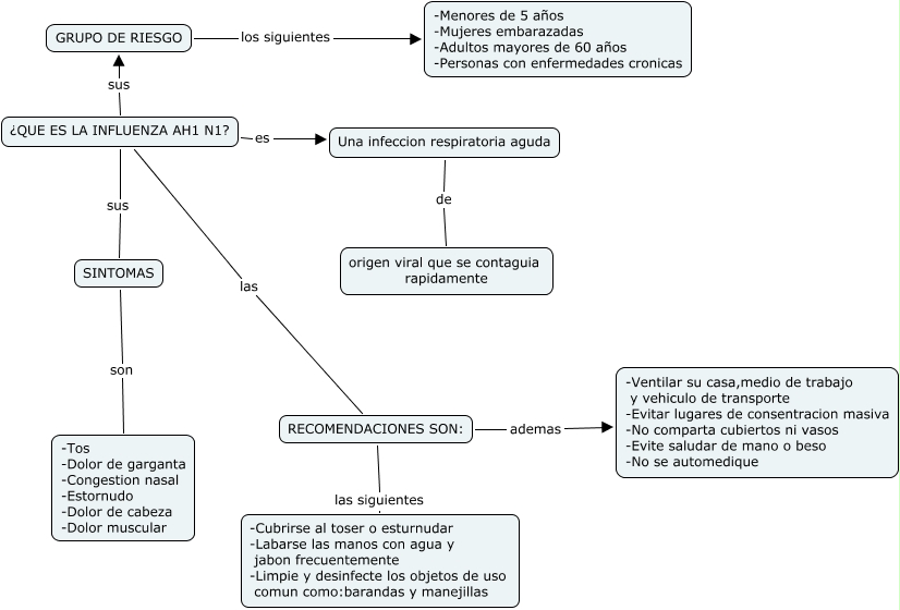 Este Cmap, tiene información relacionada con: LUIS Y JHORDY, ¿QUE ES LA INFLUENZA AH1 N1? es Una infeccion respiratoria aguda, RECOMENDACIONES SON: las siguientes -Cubrirse al toser o esturnudar -Labarse las manos con agua y jabon frecuentemente -Limpie y desinfecte los objetos de uso comun como:barandas y manejillas, SINTOMAS son -Tos -Dolor de garganta -Congestion nasal -Estornudo -Dolor de cabeza -Dolor muscular, GRUPO DE RIESGO los siguientes -Menores de 5 años -Mujeres embarazadas -Adultos mayores de 60 años -Personas con enfermedades cronicas, RECOMENDACIONES SON: ademas -Ventilar su casa,medio de trabajo y vehiculo de transporte -Evitar lugares de consentracion masiva -No comparta cubiertos ni vasos -Evite saludar de mano o beso -No se automedique, ¿QUE ES LA INFLUENZA AH1 N1? las RECOMENDACIONES SON:, ¿QUE ES LA INFLUENZA AH1 N1? sus GRUPO DE RIESGO, Una infeccion respiratoria aguda de origen viral que se contaguia rapidamente, ¿QUE ES LA INFLUENZA AH1 N1? sus SINTOMAS