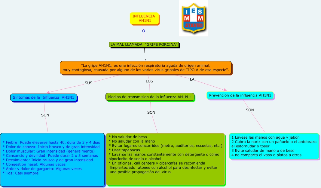 Este Cmap, tiene información relacionada con: DENYS Y ENRIQUE, "La gripe AH1N1, es una infección respiratoria aguda de origen animal, muy contagiosa, causada por alguno de los varios virus gripales de TIPO A de esa especie". SUS Sintomas de la Influenza AH1N1, LA MAL LLAMADA "GRIPE PORCINA" "La gripe AH1N1, es una infección respiratoria aguda de origen animal, muy contagiosa, causada por alguno de los varios virus gripales de TIPO A de esa especie"., "La gripe AH1N1, es una infección respiratoria aguda de origen animal, muy contagiosa, causada por alguno de los varios virus gripales de TIPO A de esa especie". LOS Medios de transmision de la influenza AH1N1:, Medios de transmision de la influenza AH1N1: SON * No saludar de beso * No saludar con la mano * Evitar lugares concurridos (metro, auditorios, escuelas, etc.) * Usar tapabocas * Lavarse las manos constantemente con detergente o como hipoclorito de sodio o alcohol. * En oficinas, call centers y cibercafés se recomienda limpiarteclado ratones con alcohol para desinfectar y evitar una posible propagación del virus., Sintomas de la Influenza AH1N1 SON * Fiebre: Puede elevarse hasta 40, dura de 3 y 4 días * Dolor de cabeza: Inicio brusco y de gran intensidad * Dolor muscular: Gran intensidad (generalmente) * Cansancio y devilidad: Puede durar 2 o 3 semanas * Decaimiento: Inicio brusco y de gran intensidad * Congestion nasal: Algunas veces * Ardor y dolor de garganta: Algunas veces * Tos: Casi siempre, "La gripe AH1N1, es una infección respiratoria aguda de origen animal, muy contagiosa, causada por alguno de los varios virus gripales de TIPO A de esa especie". LA Prevencion de la influencia AH1N1, INFLUENCIA AH1N1 O LA MAL LLAMADA "GRIPE PORCINA", Prevencion de la influencia AH1N1 SON 1 Lávese las manos con agua y jabón 2 Cubra la nariz con un pañuelo o el antebrazo al estornudar o toser 3 Evite saludar de mano o de beso 4 no comparta el vaso o platos a otros