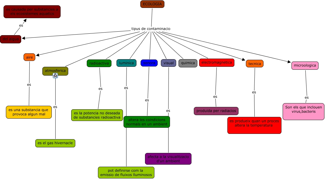 Este Cmap, tiene información relacionada con: ecologia, del aigua es es causada per substancies a els ecosistemes aquatics, tecnica es es produeix quan un proces altera la temperatura, atmosferica es es el gas hivernacle, ECOLOGIA tipus de contaminacio microologica, ECOLOGIA tipus de contaminacio electromagnetica, ECOLOGIA tipus de contaminacio sonora, ECOLOGIA tipus de contaminacio atmosferica, electromagnetica es produida per radiacios, visual es afecta a la visualitzacio d'un ambient, microologica es Son els que inclouen virus,bacteris, sonora es altera les coindicions normals en un ambient, aire es es una substancia que provoca algun mal, ECOLOGIA tipus de contaminacio del aigua, ECOLOGIA tipus de contaminacio quimica, ECOLOGIA tipus de contaminacio radioactiva, ECOLOGIA tipus de contaminacio luminica, ECOLOGIA tipus de contaminacio visual, ECOLOGIA tipus de contaminacio tecnica, radioactiva es es la potencia no deseada de substancies radioactiva, ECOLOGIA tipus de contaminacio aire