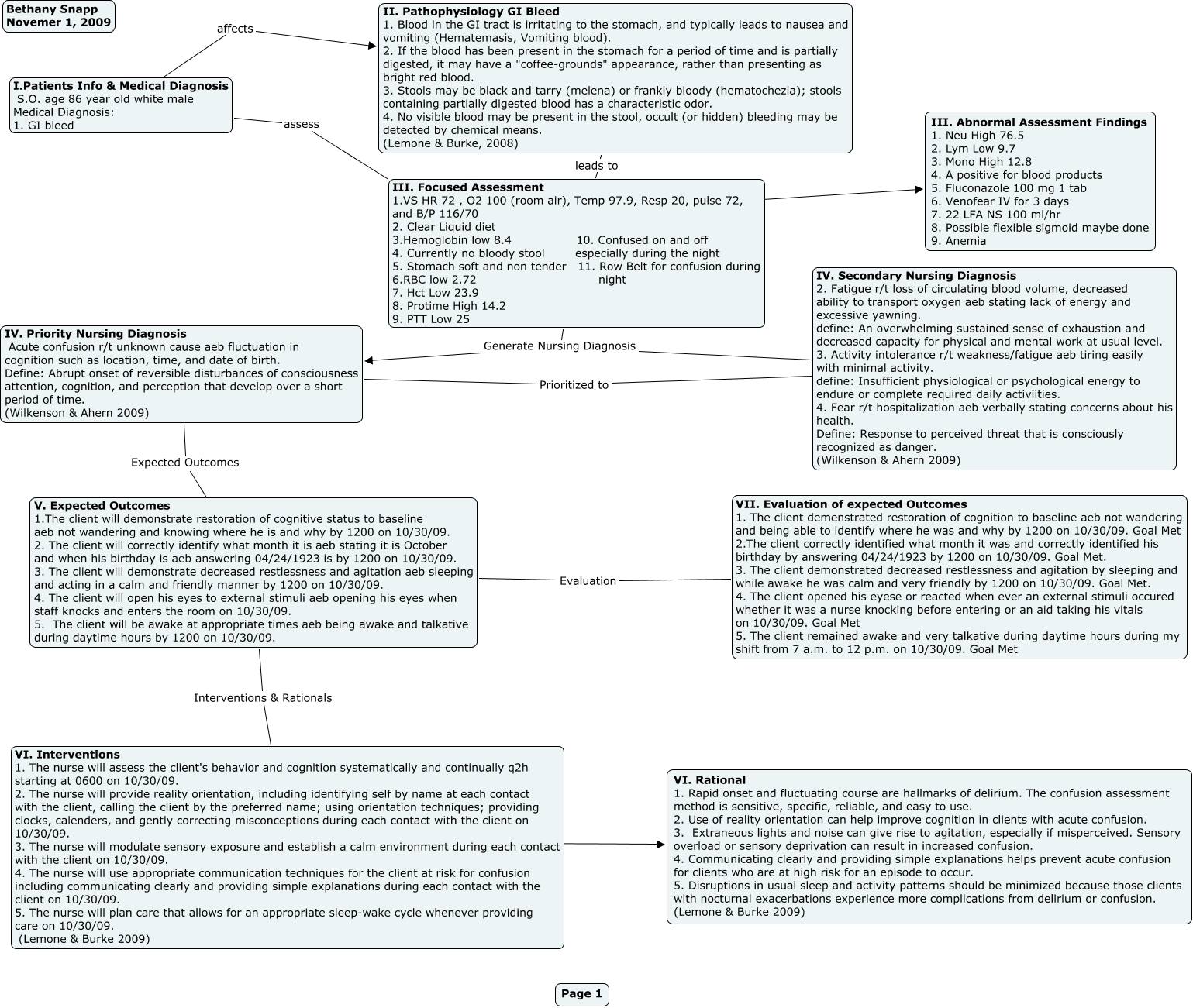 This Concept Map, created with IHMC CmapTools, has information related to: 31-02, V. Expected Outcomes 1.The client will demonstrate restoration of cognitive status to baseline aeb not wandering and knowing where he is and why by 1200 on 10/30/09. 2. The client will correctly identify what month it is aeb stating it is October and when his birthday is aeb answering 04/24/1923 is by 1200 on 10/30/09. 3. The client will demonstrate decreased restlessness and agitation aeb sleeping and acting in a calm and friendly manner by 1200 on 10/30/09. 4. The client will open his eyes to external stimuli aeb opening his eyes when staff knocks and enters the room on 10/30/09. 5. The client will be awake at appropriate times aeb being awake and talkative during daytime hours by 1200 on 10/30/09. Interventions & Rationals VI. Interventions 1. The nurse will assess the client's behavior and cognition systematically and continually q2h starting at 0600 on 10/30/09. 2. The nurse will provide reality orientation, including identifying self by name at each contact with the client, calling the client by the preferred name; using orientation techniques; providing clocks, calenders, and gently correcting misconceptions during each contact with the client on 10/30/09. 3. The nurse will modulate sensory exposure and establish a calm environment during each contact with the client on 10/30/09. 4. The nurse will use appropriate communication techniques for the client at risk for confusion including communicating clearly and providing simple explanations during each contact with the client on 10/30/09. 5. The nurse will plan care that allows for an appropriate sleep-wake cycle whenever providing care on 10/30/09. (Lemone & Burke 2009), III. Focused Assessment 1.VS HR 72 , O2 100 (room air), Temp 97.9, Resp 20, pulse 72, and B/P 116/70 2. Clear Liquid diet 3.Hemoglobin low 8.4 10. Confused on and off 4. Currently no bloody stool especially during the night 5. Stomach soft and non tender 11. Row Belt for confusion during 6.RBC low 2.72 night 7. Hct Low 23.9 8. Protime High 14.2 9. PTT Low 25 Generate Nursing Diagnosis IV. Secondary Nursing Diagnosis 2. Fatigue r/t loss of circulating blood volume, decreased ability to transport oxygen aeb stating lack of energy and excessive yawning. define: An overwhelming sustained sense of exhaustion and decreased capacity for physical and mental work at usual level. 3. Activity intolerance r/t weakness/fatigue aeb tiring easily with minimal activity. define: Insufficient physiological or psychological energy to endure or complete required daily activiities. 4. Fear r/t hospitalization aeb verbally stating concerns about his health. Define: Response to perceived threat that is consciously recognized as danger. (Wilkenson & Ahern 2009), VI. Interventions 1. The nurse will assess the client's behavior and cognition systematically and continually q2h starting at 0600 on 10/30/09. 2. The nurse will provide reality orientation, including identifying self by name at each contact with the client, calling the client by the preferred name; using orientation techniques; providing clocks, calenders, and gently correcting misconceptions during each contact with the client on 10/30/09. 3. The nurse will modulate sensory exposure and establish a calm environment during each contact with the client on 10/30/09. 4. The nurse will use appropriate communication techniques for the client at risk for confusion including communicating clearly and providing simple explanations during each contact with the client on 10/30/09. 5. The nurse will plan care that allows for an appropriate sleep-wake cycle whenever providing care on 10/30/09. (Lemone & Burke 2009) ???? VI. Rational 1. Rapid onset and fluctuating course are hallmarks of delirium. The confusion assessment method is sensitive, specific, reliable, and easy to use. 2. Use of reality orientation can help improve cognition in clients with acute confusion. 3. Extraneous lights and noise can give rise to agitation, especially if misperceived. Sensory overload or sensory deprivation can result in increased confusion. 4. Communicating clearly and providing simple explanations helps prevent acute confusion for clients who are at high risk for an episode to occur. 5. Disruptions in usual sleep and activity patterns should be minimized because those clients with nocturnal exacerbations experience more complications from delirium or confusion. (Lemone & Burke 2009), III. Focused Assessment 1.VS HR 72 , O2 100 (room air), Temp 97.9, Resp 20, pulse 72, and B/P 116/70 2. Clear Liquid diet 3.Hemoglobin low 8.4 10. Confused on and off 4. Currently no bloody stool especially during the night 5. Stomach soft and non tender 11. Row Belt for confusion during 6.RBC low 2.72 night 7. Hct Low 23.9 8. Protime High 14.2 9. PTT Low 25 Generate Nursing Diagnosis IV. Priority Nursing Diagnosis Acute confusion r/t unknown cause aeb fluctuation in cognition such as location, time, and date of birth. Define: Abrupt onset of reversible disturbances of consciousness attention, cognition, and perception that develop over a short period of time. (Wilkenson & Ahern 2009), II. Pathophysiology GI Bleed 1. Blood in the GI tract is irritating to the stomach, and typically leads to nausea and vomiting (Hematemasis, Vomiting blood). 2. If the blood has been present in the stomach for a period of time and is partially digested, it may have a "coffee-grounds" appearance, rather than presenting as bright red blood. 3. Stools may be black and tarry (melena) or frankly bloody (hematochezia); stools containing partially digested blood has a characteristic odor. 4. No visible blood may be present in the stool, occult (or hidden) bleeding may be detected by chemical means. (Lemone & Burke, 2008) leads to III. Focused Assessment 1.VS HR 72 , O2 100 (room air), Temp 97.9, Resp 20, pulse 72, and B/P 116/70 2. Clear Liquid diet 3.Hemoglobin low 8.4 10. Confused on and off 4. Currently no bloody stool