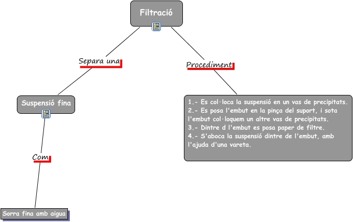 Este Cmap, tiene información relacionada con: Mapa Filtració, Suspensió fina Com Sorra fina amb aigua, Filtració Procediment 1.- Es col·loca la suspensió en un vas de precipitats. 2.- Es posa l'embut en la pinça del suport, i sota l'embut col·loquem un altre vas de precipitats. 3.- Dintre d l'embut es posa paper de filtre. 4.- S'aboca la suspensió dintre de l'embut, amb l'ajuda d'una vareta., Filtració Separa una Suspensió fina