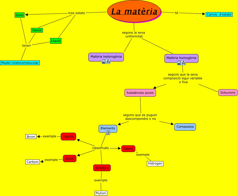 Este mapa conceptual tiene información relacionada a: La matèria, Gasos tenen Model cineticomolucular, Sólids exemple Carboni, La matèria tres estats Sòlid, Elements classificats Sólids, La matèria segons la seva uniformitat Matèria heterogènia, Sòlid tenen Model cineticomolucular, La matèria segons la seva uniformitat Matèria homogènia, Gasos exemple Hidrogen, Líquid tenen Model cineticomolucular, Sintètics exemple Plutoni, Elements classificats Gasos, Elements classificats Líquids, La matèria tres estats Gasos, La matèria tres estats Líquid, La matèria té Canvis d'estats, Subsàncies pures segons que es puguin descompondre o no Elements, Subsàncies pures segons que es puguin descompondre o no Compostos, Matèria homogènia segons que la seva composició sigui variable o fixa Subsàncies pures, Elements classificats Sintètics, Líquids exemple Brom