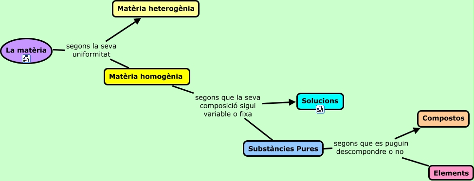 Este Cmap, tiene información relacionada con: Materia (1), La matèria segons la seva uniformitat Matèria homogènia, Substàncies Pures segons que es puguin descompondre o no Compostos, Matèria homogènia segons que la seva composició sigui variable o fixa Substàncies Pures, La matèria segons la seva uniformitat Matèria heterogènia, Substàncies Pures segons que es puguin descompondre o no Elements, Matèria homogènia segons que la seva composició sigui variable o fixa Solucions