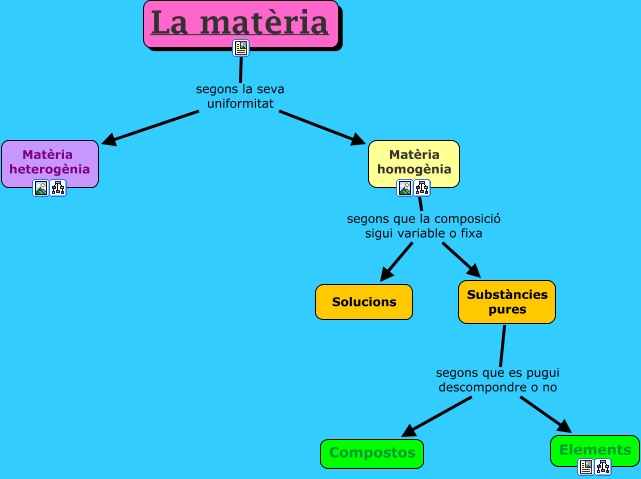 Este Cmap, tiene información relacionada con: La matèria, Substàncies pures segons que es pugui descompondre o no Elements, La matèria segons la seva uniformitat Matèria heterogènia, La matèria segons la seva uniformitat Matèria homogènia, Substàncies pures segons que es pugui descompondre o no Compostos, Matèria homogènia segons que la composició sigui variable o fixa Substàncies pures, Matèria homogènia segons que la composició sigui variable o fixa Solucions