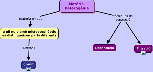 Este Cmap, tiene información relacionada con: Matèria heterogènia, Matèria heterogènia tècniques de separació Decantació, Matèria heterogènia tècniques de separació Filtració, a ull nu o amb microscopi òptic es distingueixen parts diferents exemple granit, Matèria heterogènia matèria en que a ull nu o amb microscopi òptic es distingueixen parts diferents